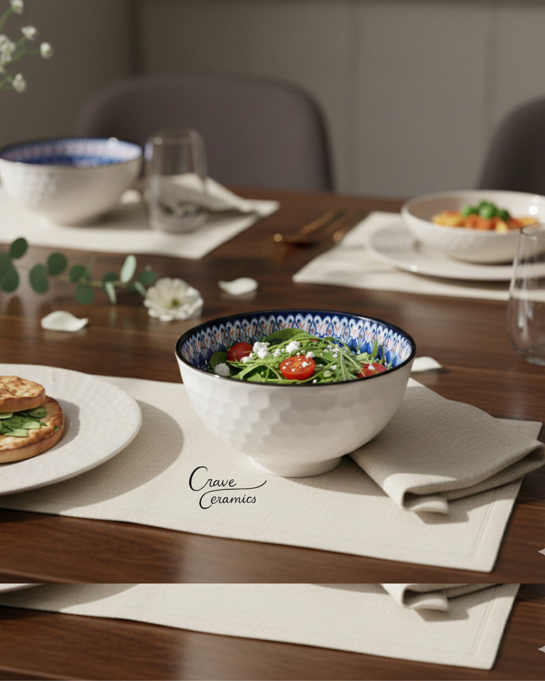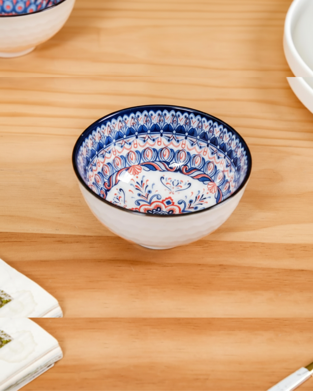 - •Vibrant Bohemian Interior: The inside is adorned with an intricate, hand-painted inspired geometric pattern in indigo blue and terracotta. This 'hidden' design detail adds a pop of color to your tabletop, making every meal feel like a special occasion.