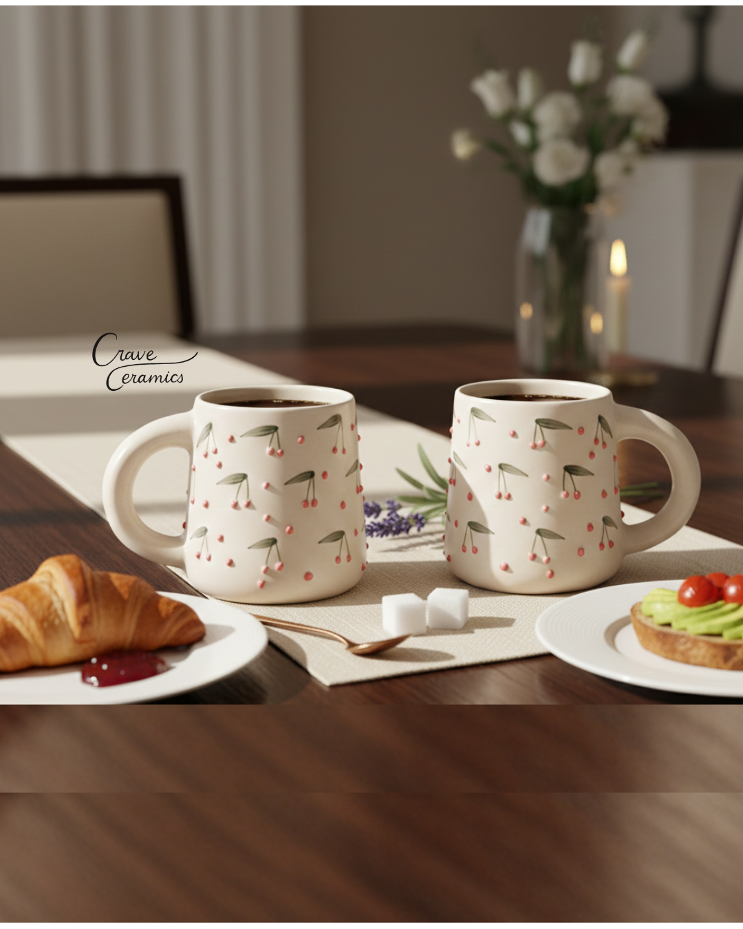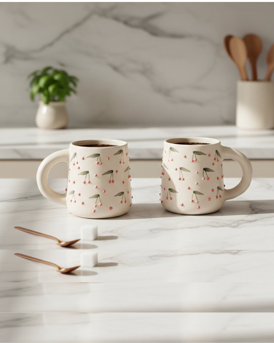 Cherry Pattern Ceramic Coffee Mugs, Set of 2 – Handmade-Style Stoneware Cups with Comfortable Handle